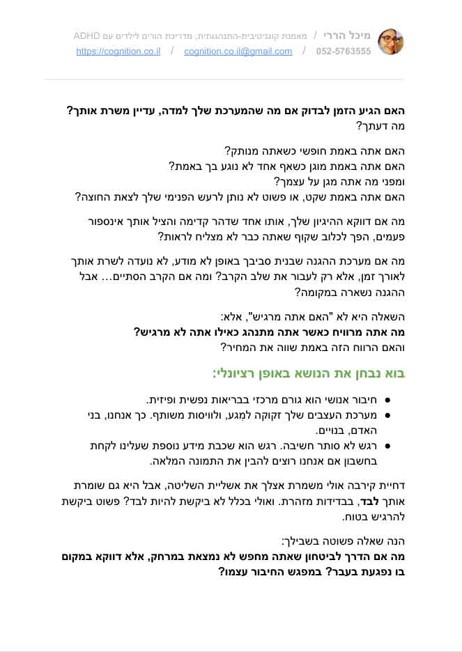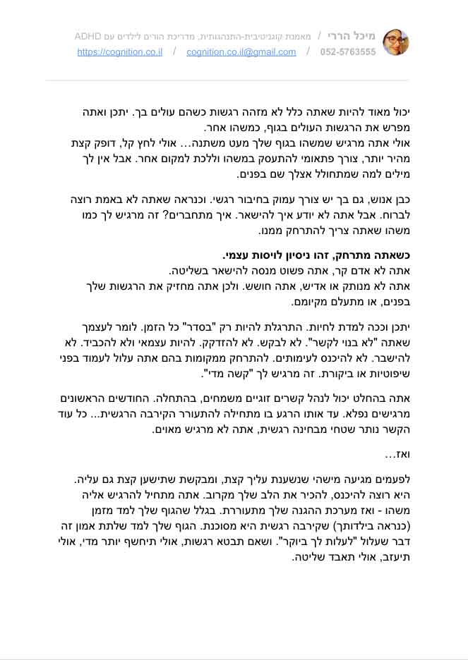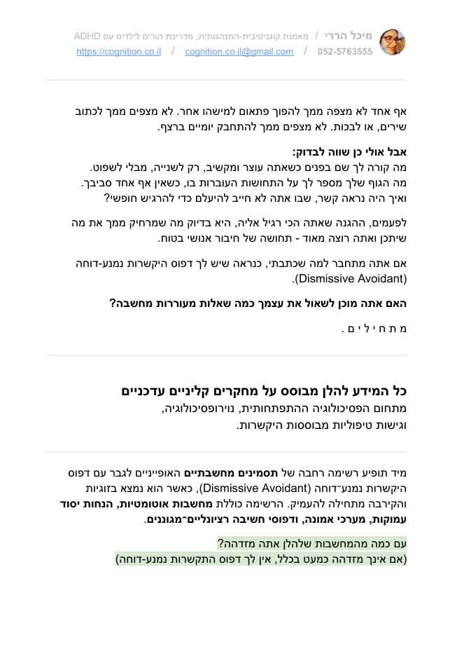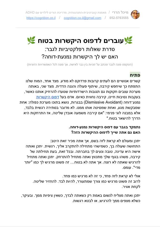 להורדה ללא עלות. שאלון רפלקטיבי לגבר, שנועד לגלות: האם אתה שייך לדפוס היקשרות נמנע-דוחה? השאלון כולל רשימה רחבה של תסמינים מחשבתיים, רגשיים והתנהגותיים התואמים את דפוס ההיקשרות Dismissive Avoidant. לפעמים, ההגנה שאתה הכי רגיל אליה, היא בדיוק מה שמרחיק ממך את מה שיתכן ואתה רוצה מאוד – תחושה של חיבור אנושי בטוח. האם אתה מוכן לשאול את עצמך כמה שאלות מעוררות מחשבה?